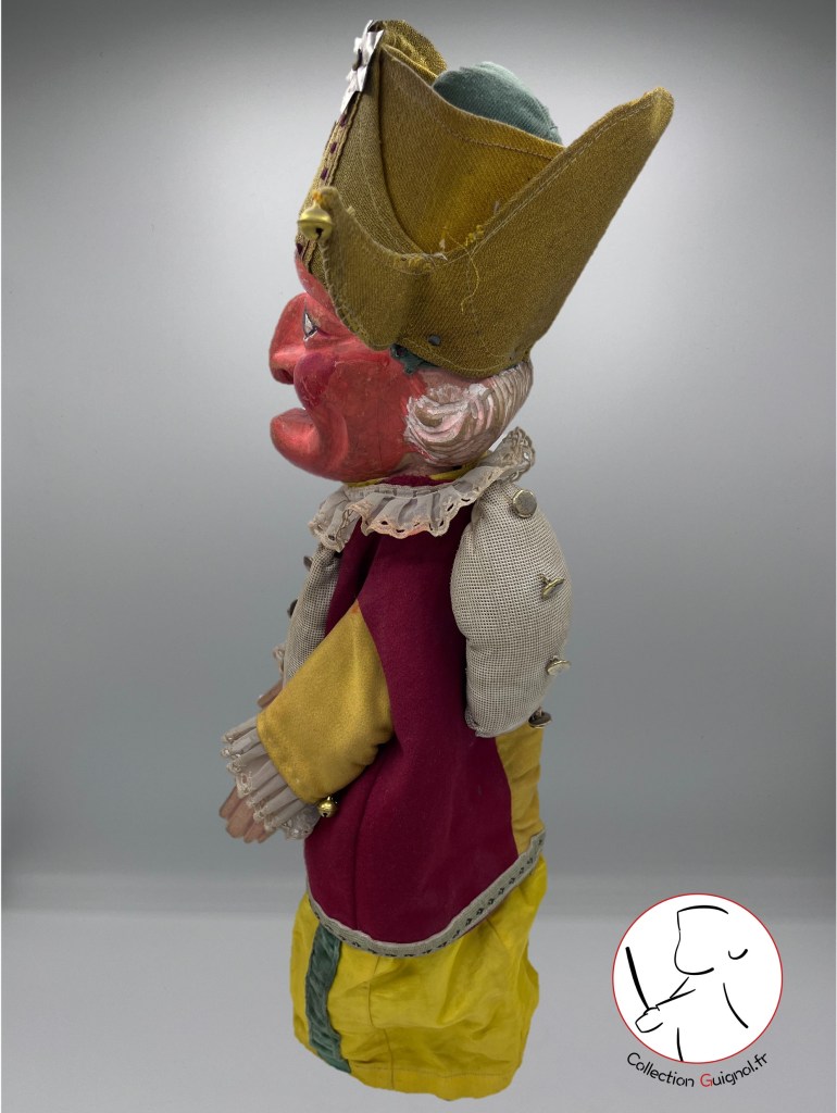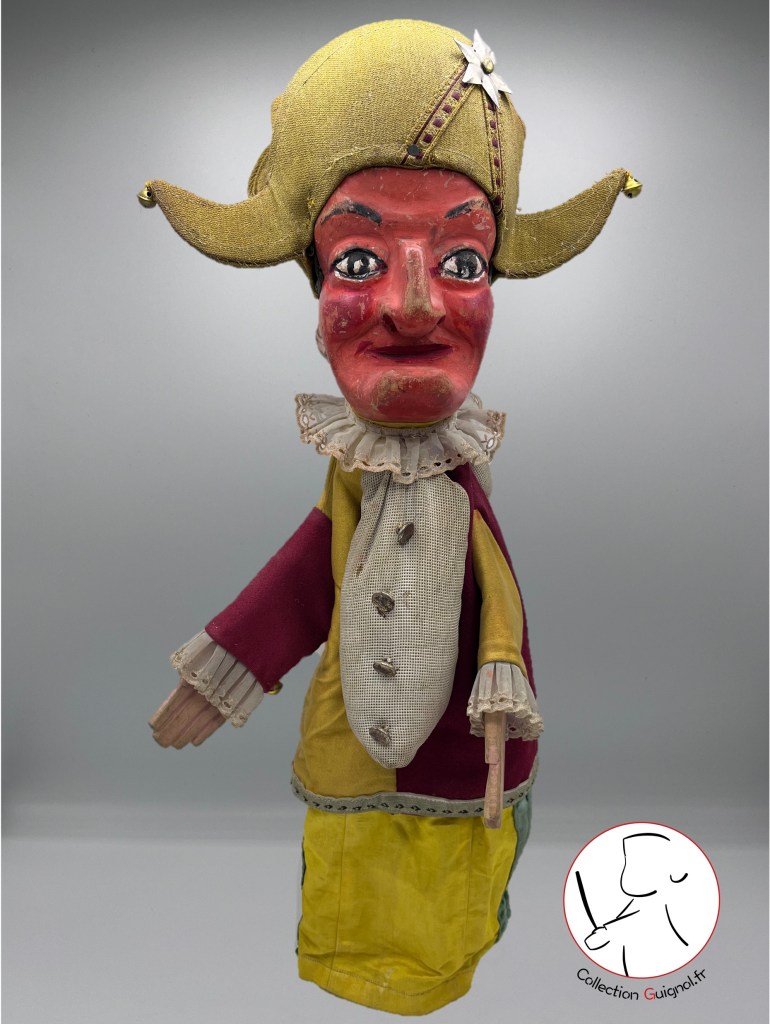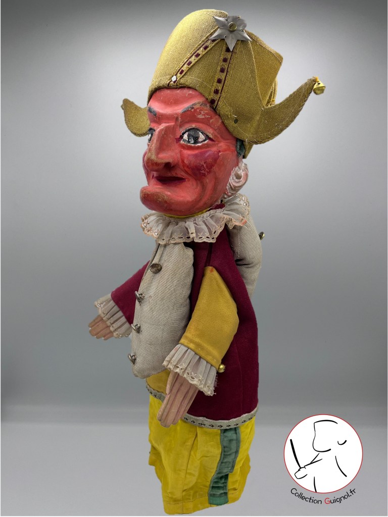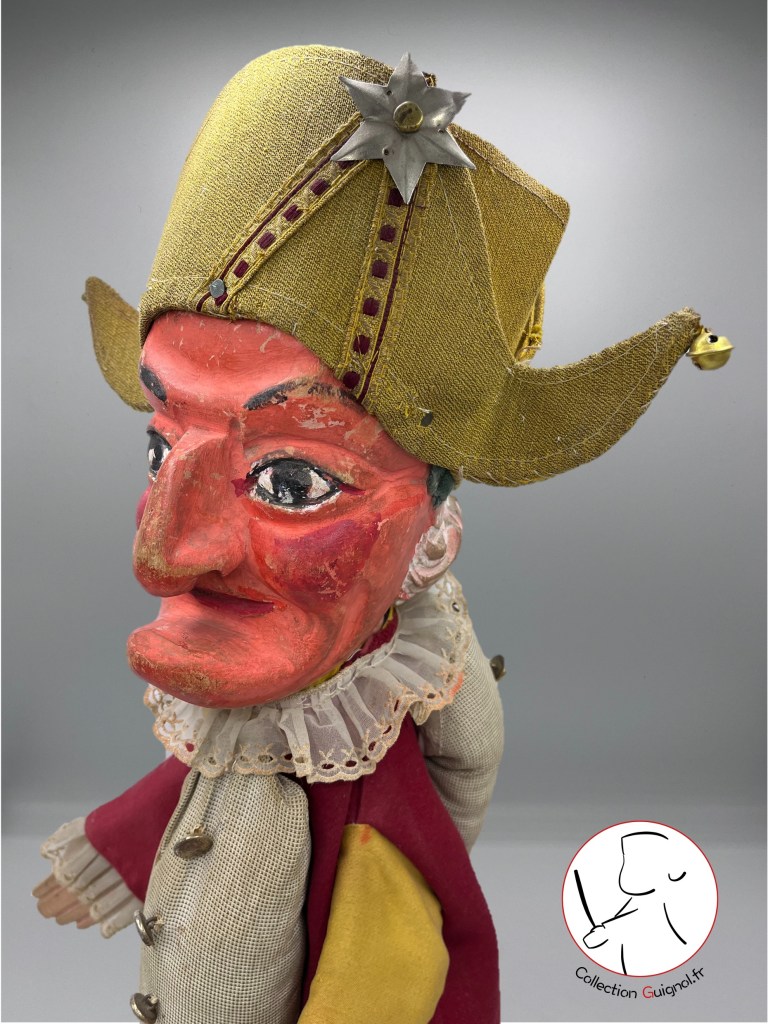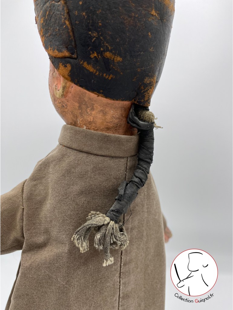 Marionnette de voyage (environ 30cm) datant de la fin du XIX° siècle. Entièrement d’origine à l’exception de sa veste qui était dans un piteux état et qui n’a pas pu être conservée. Sa nouvelle veste a été conçue en 2018 par Eliane Lacroix, ancienne couturière lyonnaise aujourd’hui retraitée.