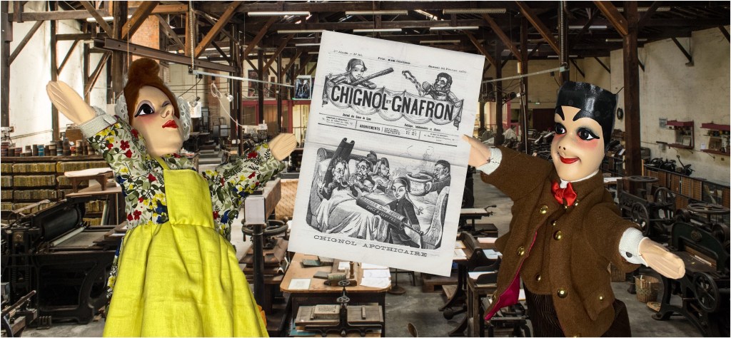 Les matrices de la collection Guignol.fr sont des plaques de métal gravées d’un motif inversé puis collées sur des planches en bois. Ces matrices étaient ensuite fixées sur la machine avant d’être recouvertes d’encre d’imprimerie et d’être pressées sur un support papier. Le motif apparait alors comme par magie…