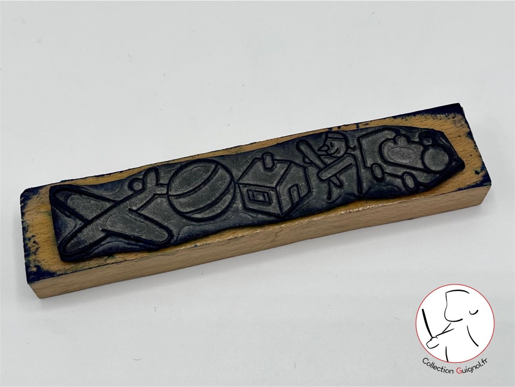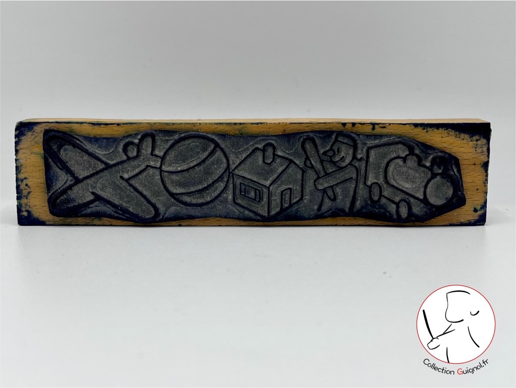 Tampon scolaire reprenant les jouets pour enfants les plus traditionnels parmi lesquels nous retrouvons notre ami Guignol. Les enfants tapissaient le tampon d’encre, le pressaient sur une feuille de papier et pouvaient se donner à leurs activités scolaires de coloriage. Années 1970.